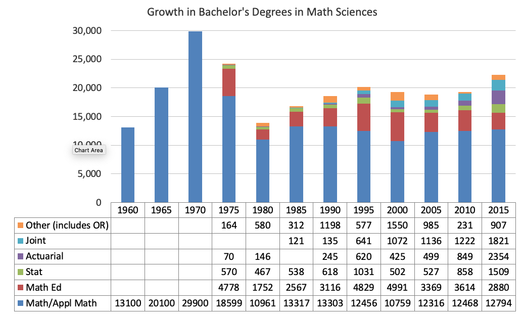 Figure 4. Number of Bachelor’s degrees awarded by departments in the mathematical sciences. Separate categories were not recorded until 1975.